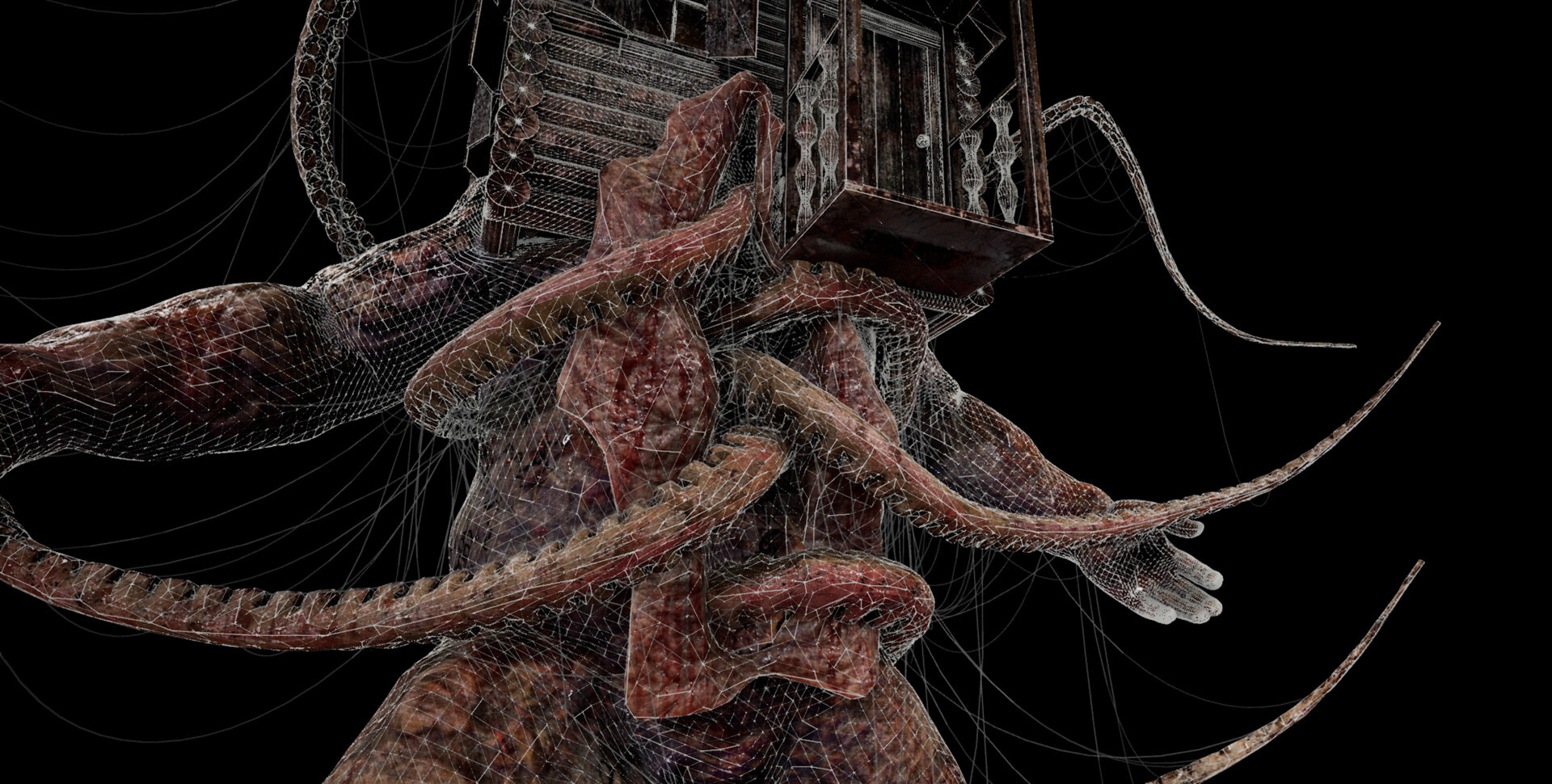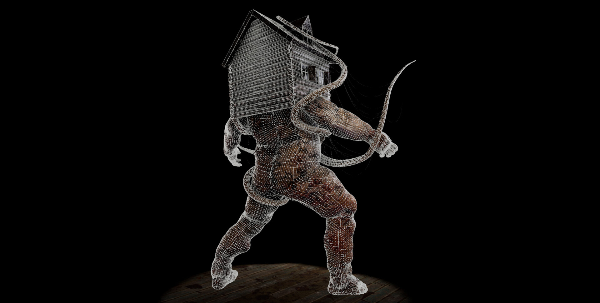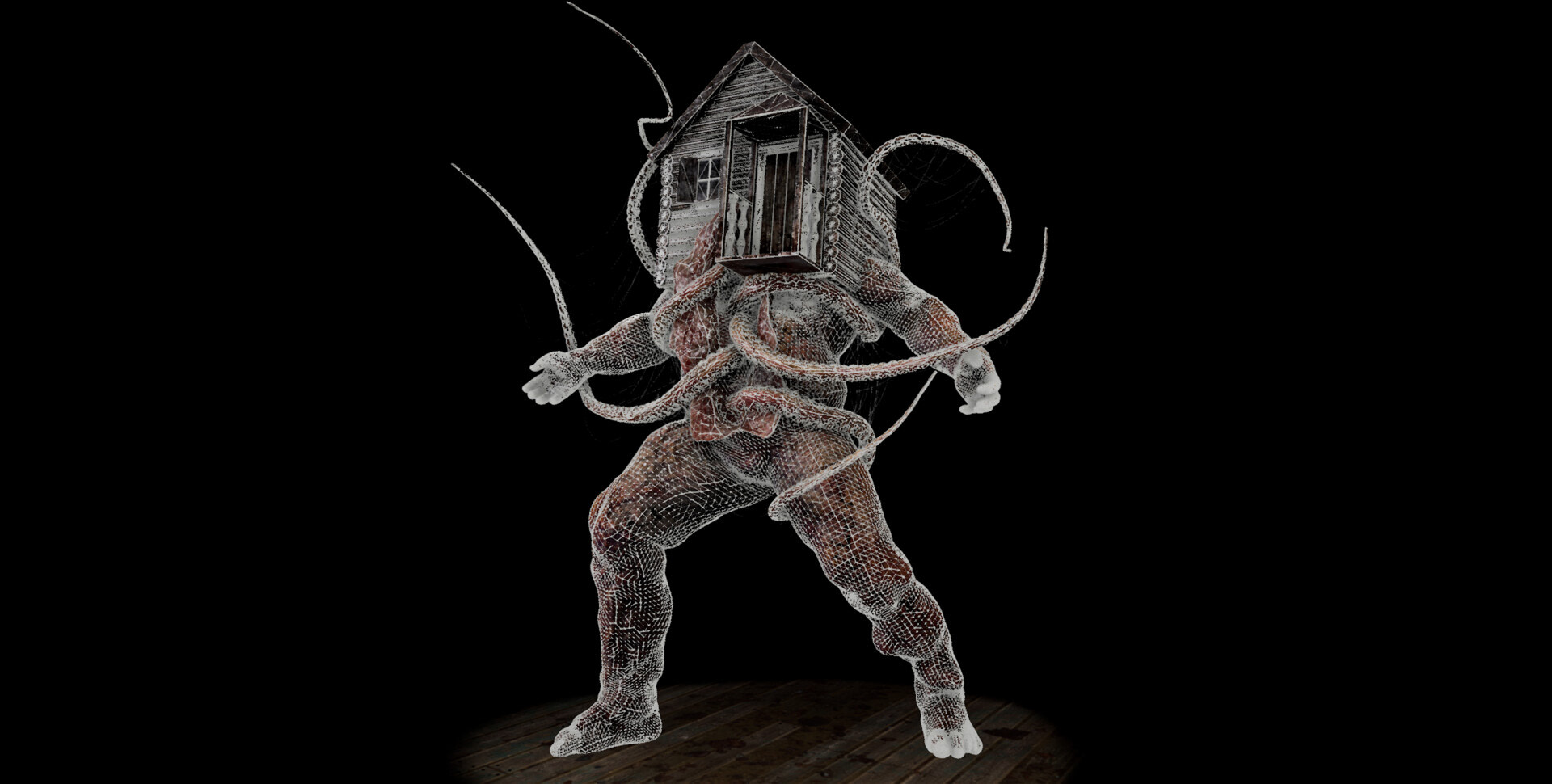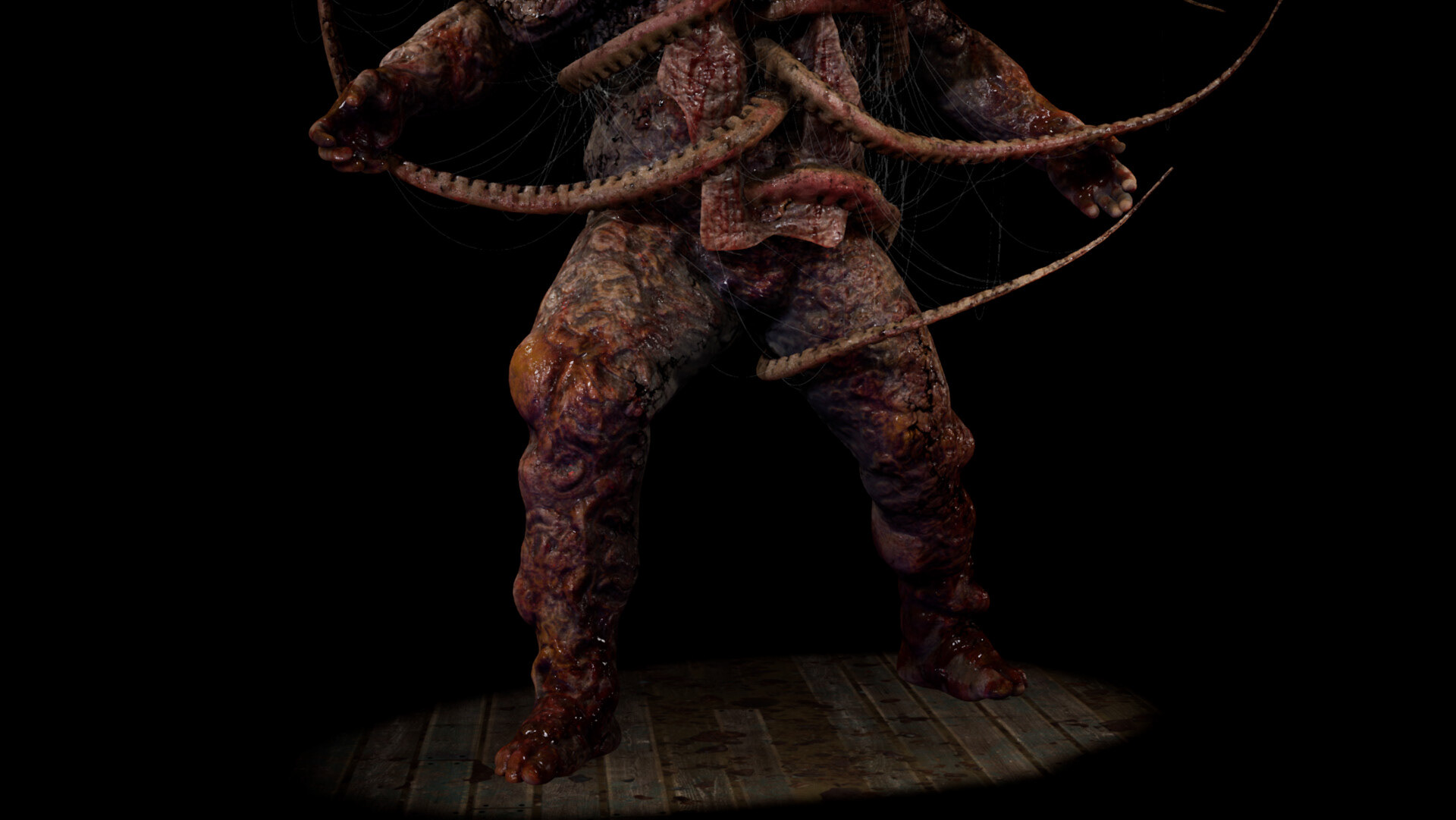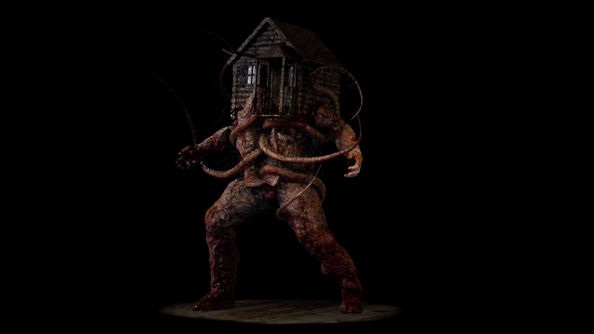 The Dollhouse Monster was created as part of a personal video game project exploring the themes of guilt, memory, and psychological horror. The game takes place inside the protagonist’s mind, where his unresolved guilt manifests as physical nightmares the innocent toys of his children, once symbols of joy, have now twisted into monstrous reflections of his inner torment. This creature embodies the weight of remorse: a rotting humanoid form fused with a decaying dollhouse, its walls and wires merging with flesh and sinew. The design blends architectural structure with organic horror, representing how the home itself once safe and warm has become a prison of regret. The model was sculpted and textured to emphasize grotesque realism and symbolic storytelling, with a focus on material contrast: aged wood, decaying flesh, and parasitic tendrils that symbolize the psychological decay spreading within the character’s mind. Software Used: • ZBrush • Maya • Substance 3D Painter • Unreal Engine