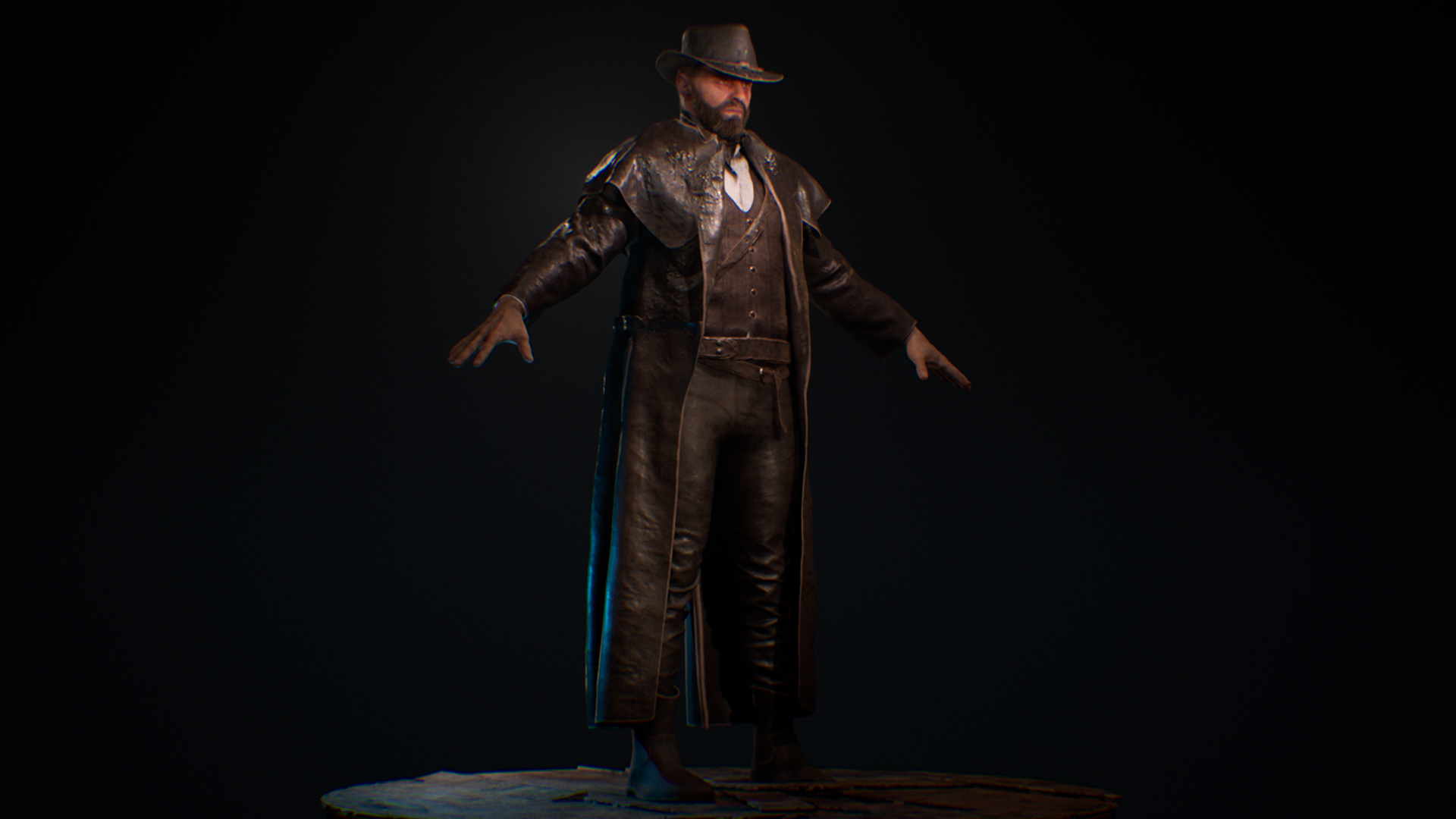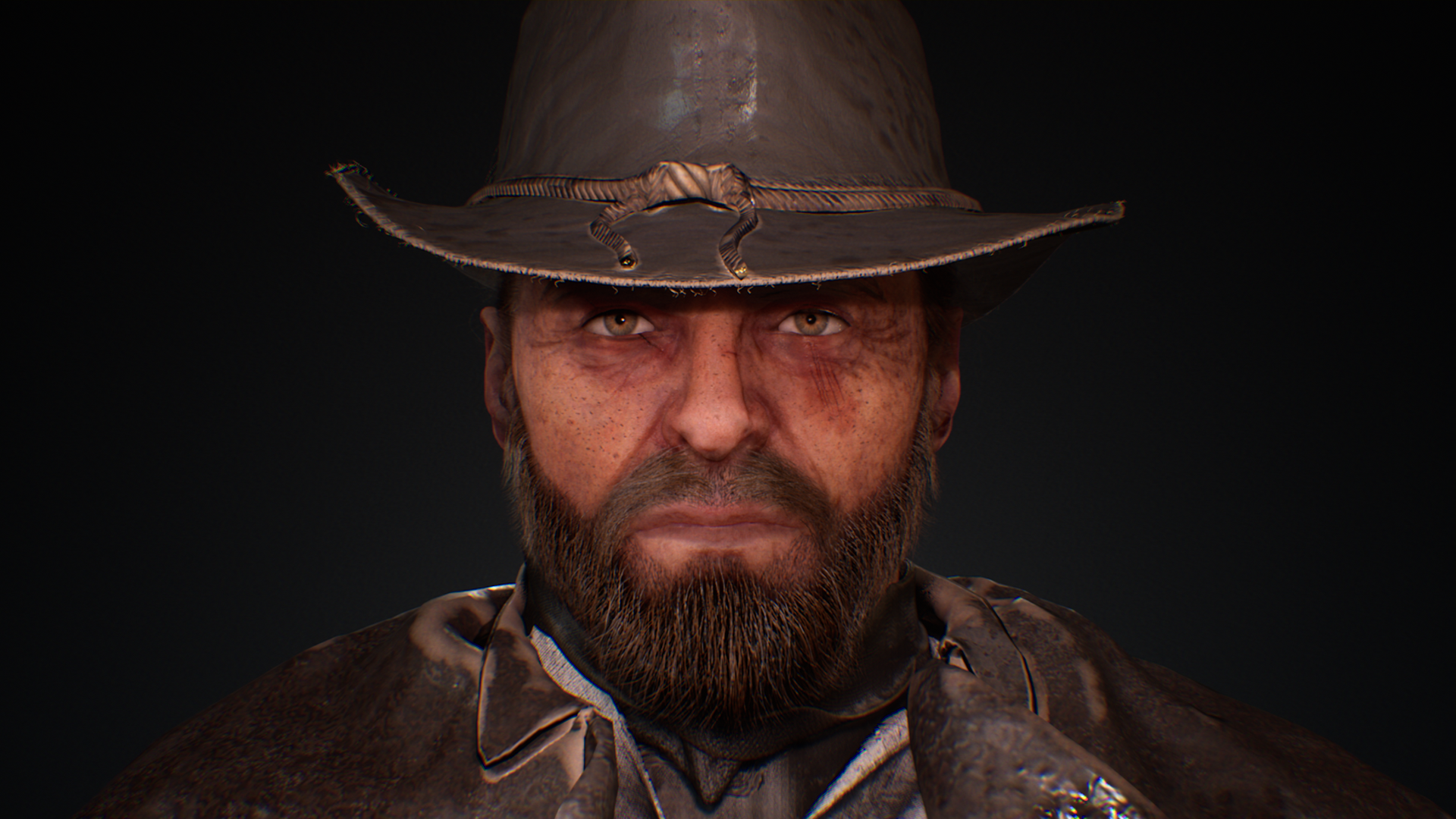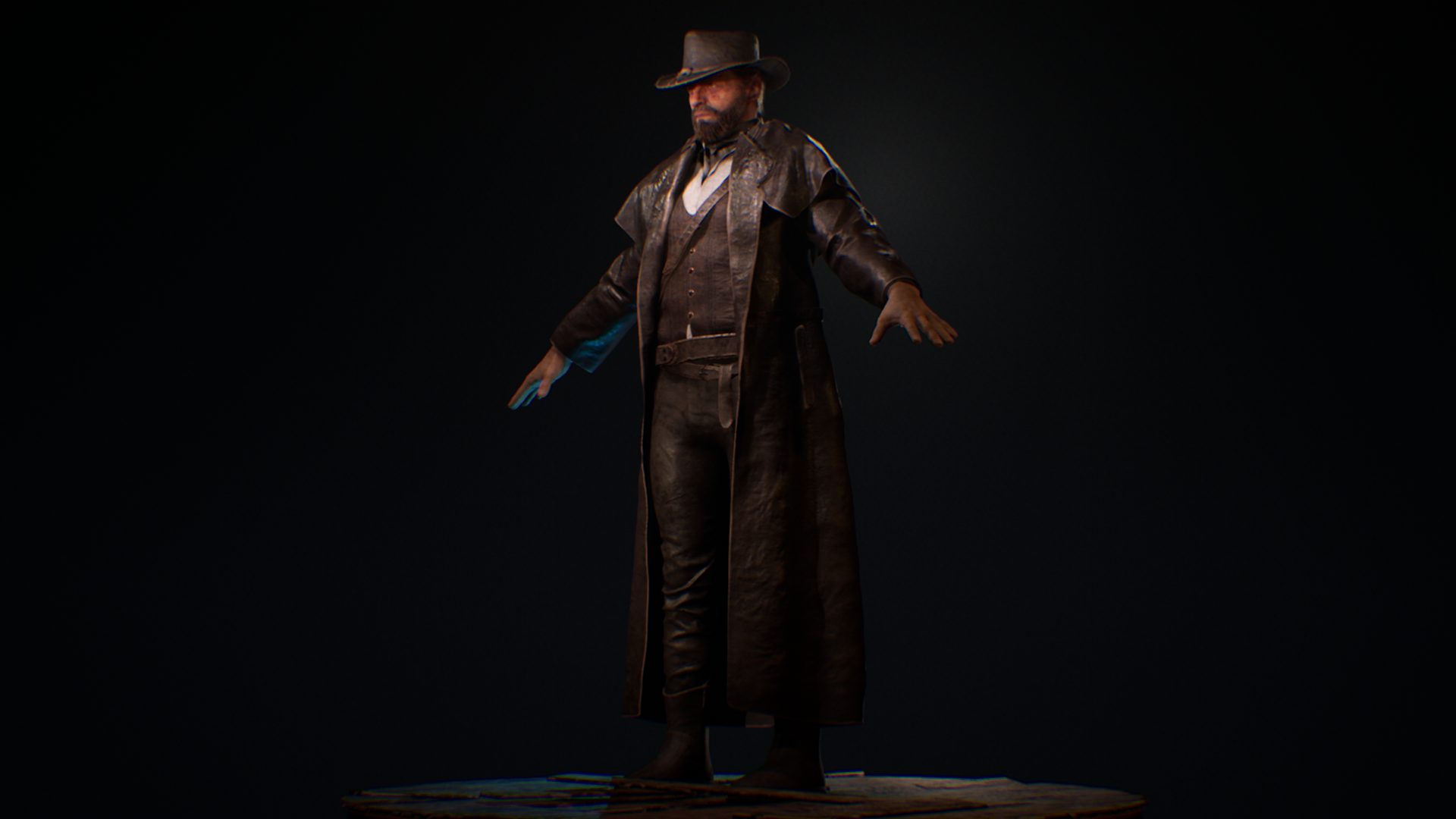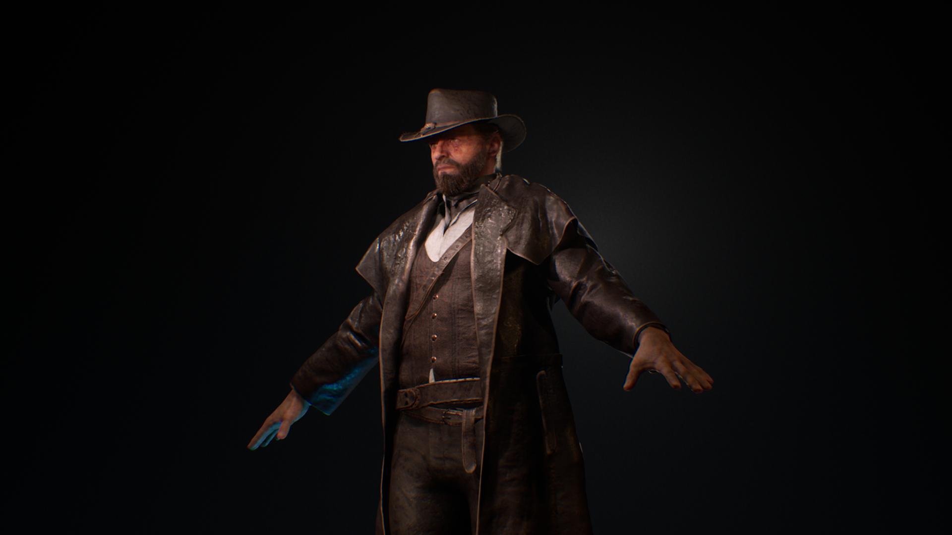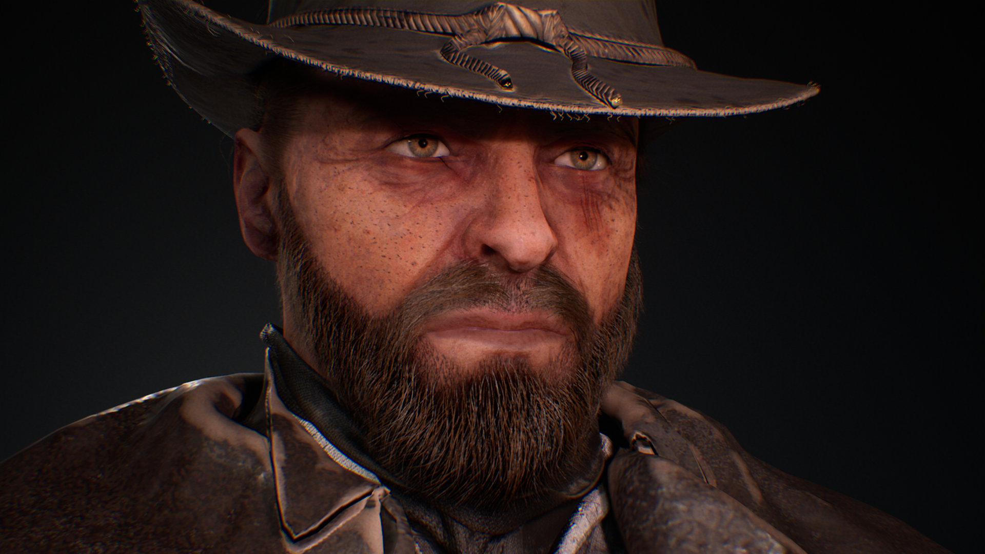 This Wild West protagonist was created as part of a personal game project during university, serving as the main playable character in a story-driven western setting. The goal was to achieve a cinematic, game-ready hero that reflects the grit and realism of the frontier while maintaining strong character presence. The character was sculpted in ZBrush, with cloth simulated and refined in Marvelous Designer to capture authentic fabric folds and layering. Substance 3D Painter was used for texturing, focusing on believable wear, leather roughness. The hair and beard were groomed in Maya, while Unreal Engine handled lighting, shading, and final rendering. This project allowed exploration of realistic character workflows, from sculpting and simulation to shading and presentation, while balancing performance and visual quality for a real-time environment.
