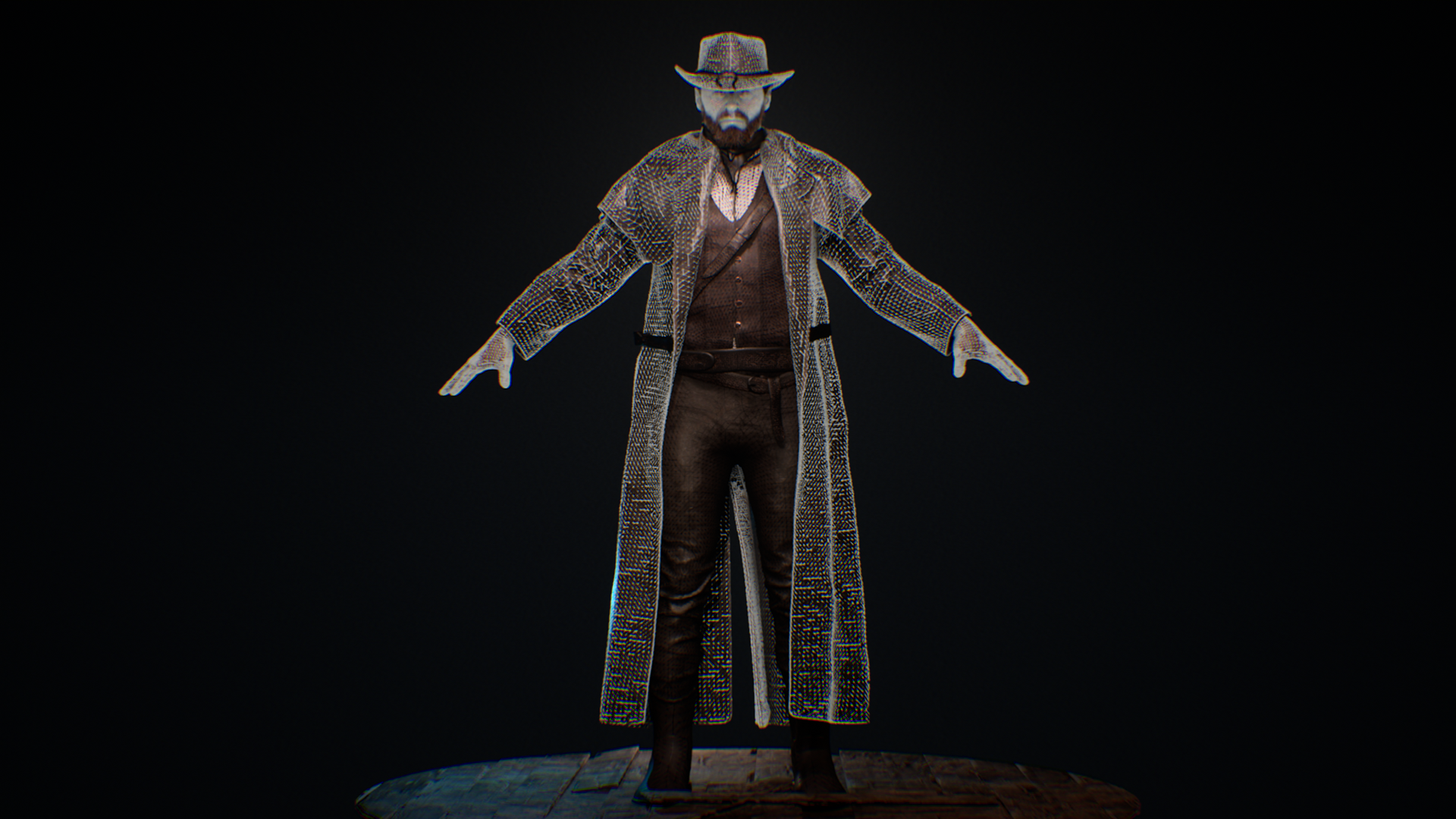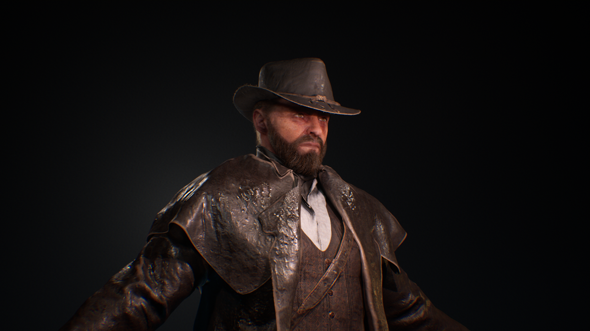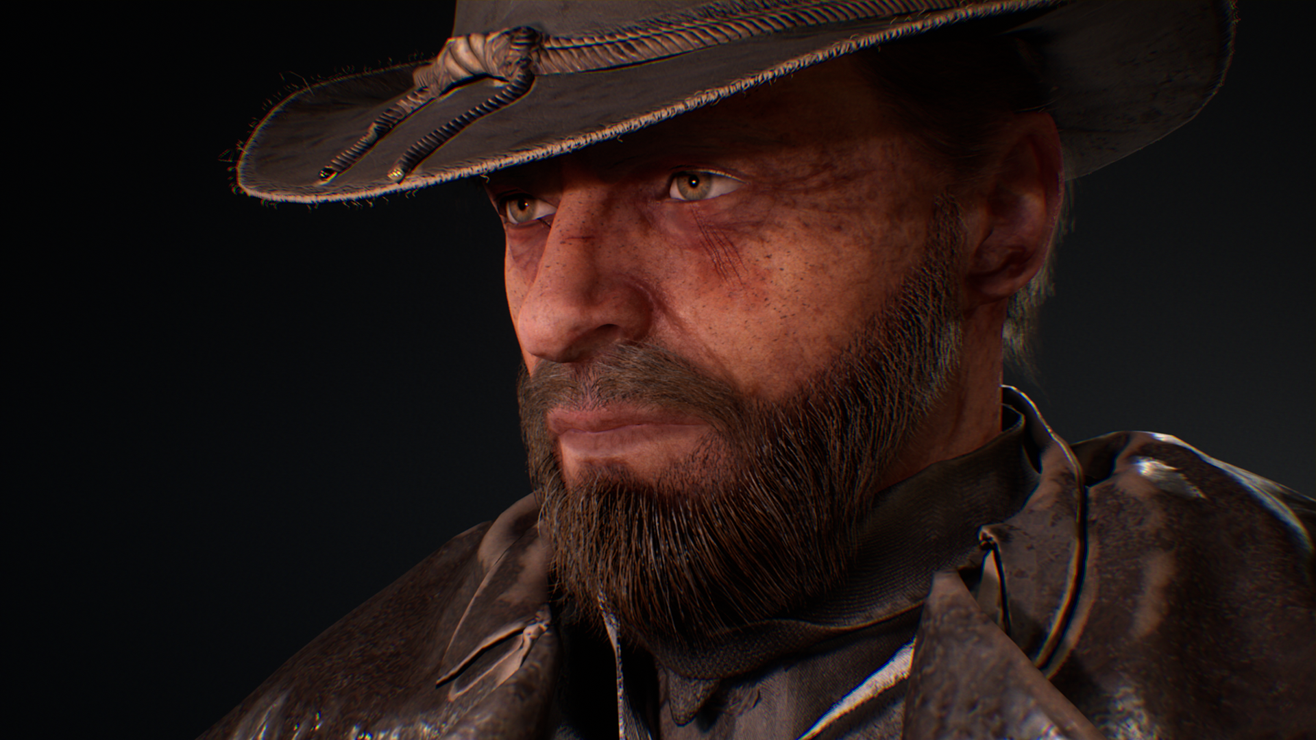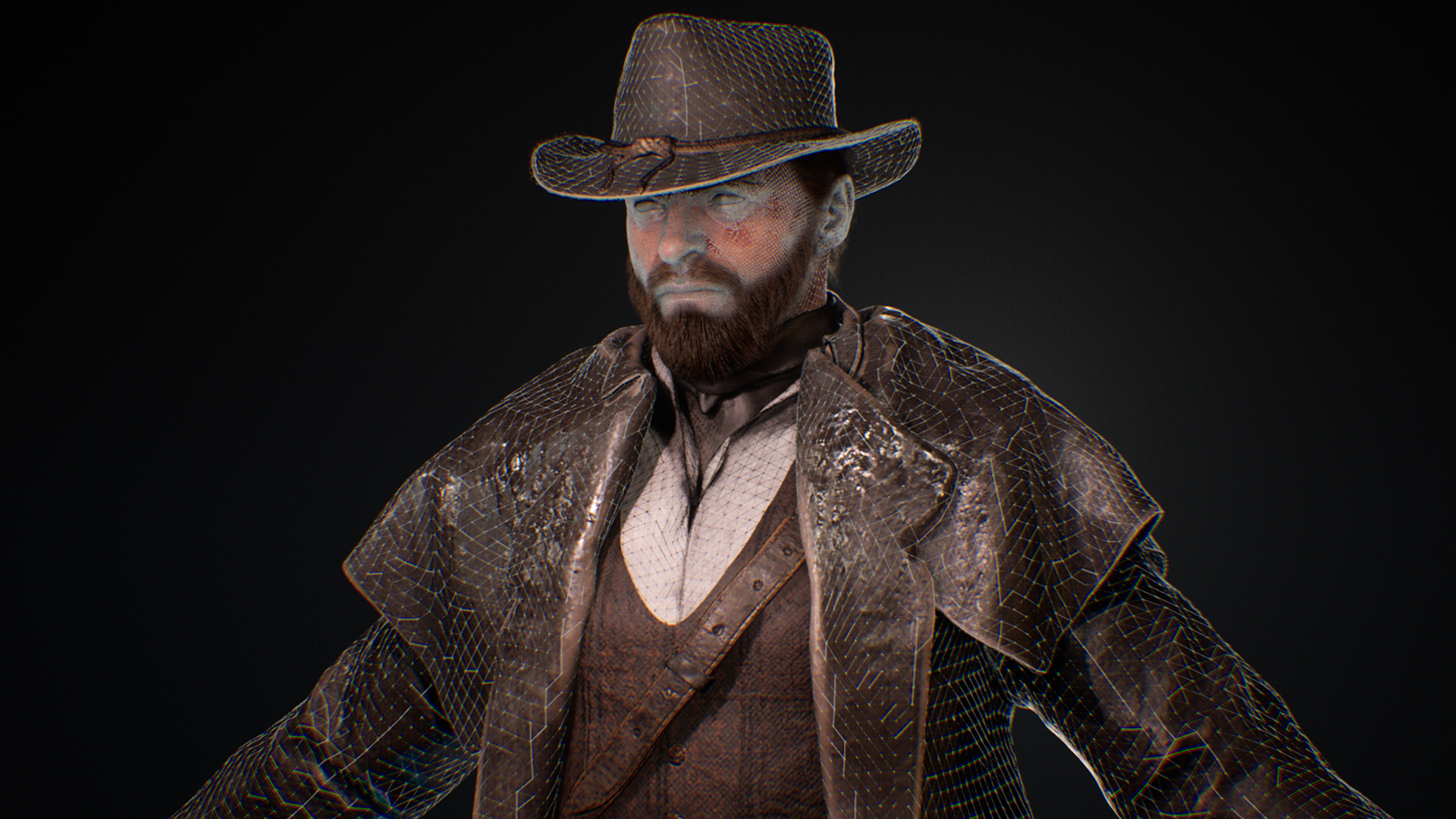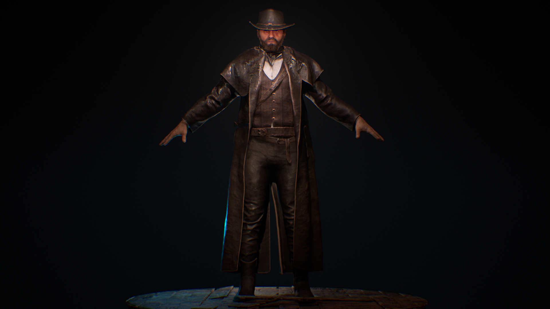 This Wild West protagonist was created as part of a personal game project during university, serving as the main playable character in a story-driven western setting. The goal was to achieve a cinematic, game-ready hero that reflects the grit and realism of the frontier while maintaining strong character presence. The character was sculpted in ZBrush, with cloth simulated and refined in Marvelous Designer to capture authentic fabric folds and layering. Substance 3D Painter was used for texturing, focusing on believable wear, leather roughness. The hair and beard were groomed in Maya, while Unreal Engine handled lighting, shading, and final rendering. This project allowed exploration of realistic character workflows, from sculpting and simulation to shading and presentation, while balancing performance and visual quality for a real-time environment.
